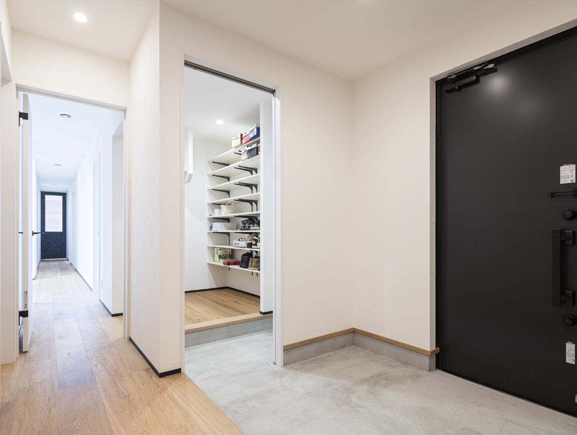 買い物帰りに便利な動線を考慮し、シューズクロークからパントリー、そしてキッチンへとスムーズにアクセスできる設計となっています。