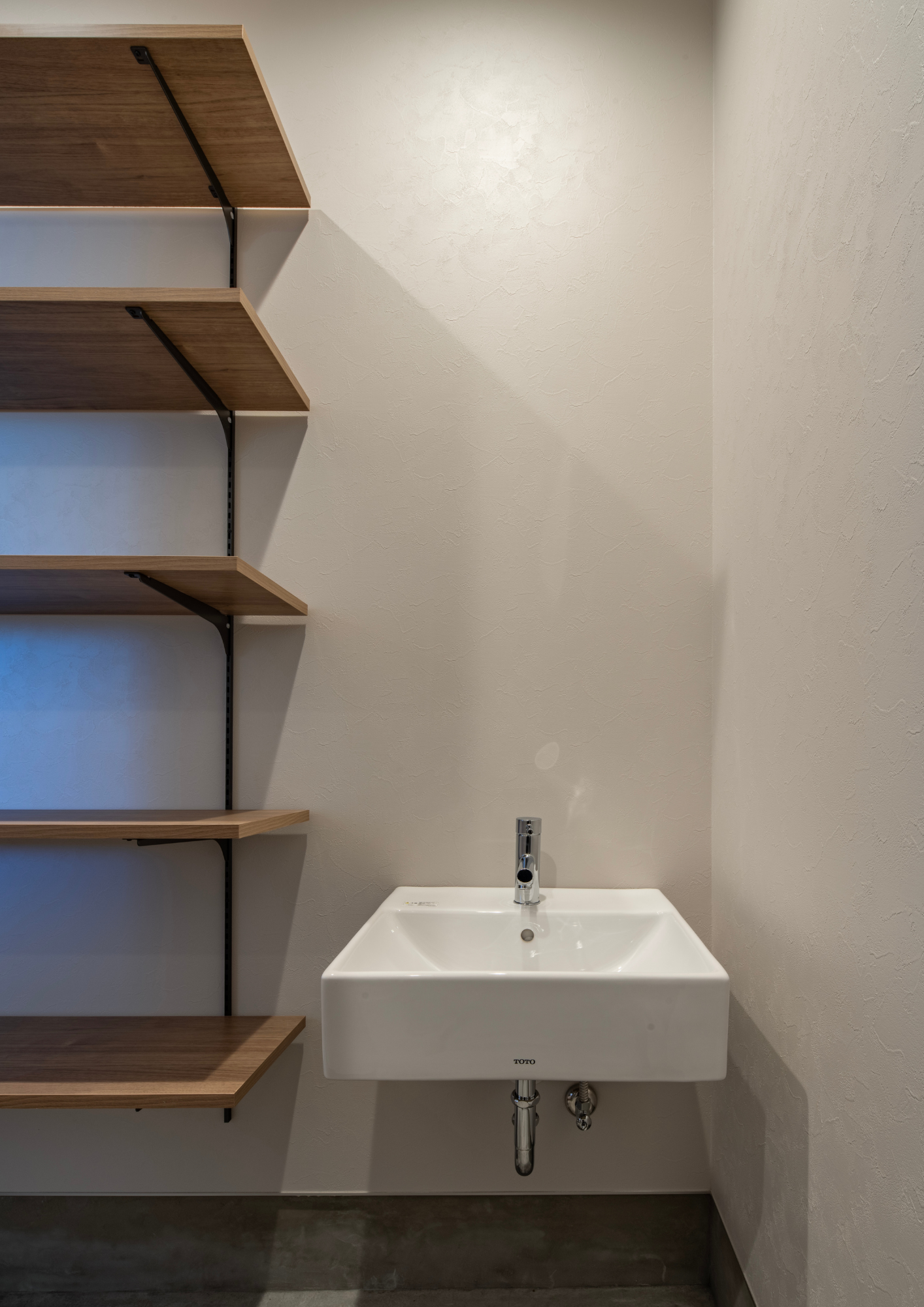 造作の洗面台と棚は大工の手仕事によるオリジナルデザイン。