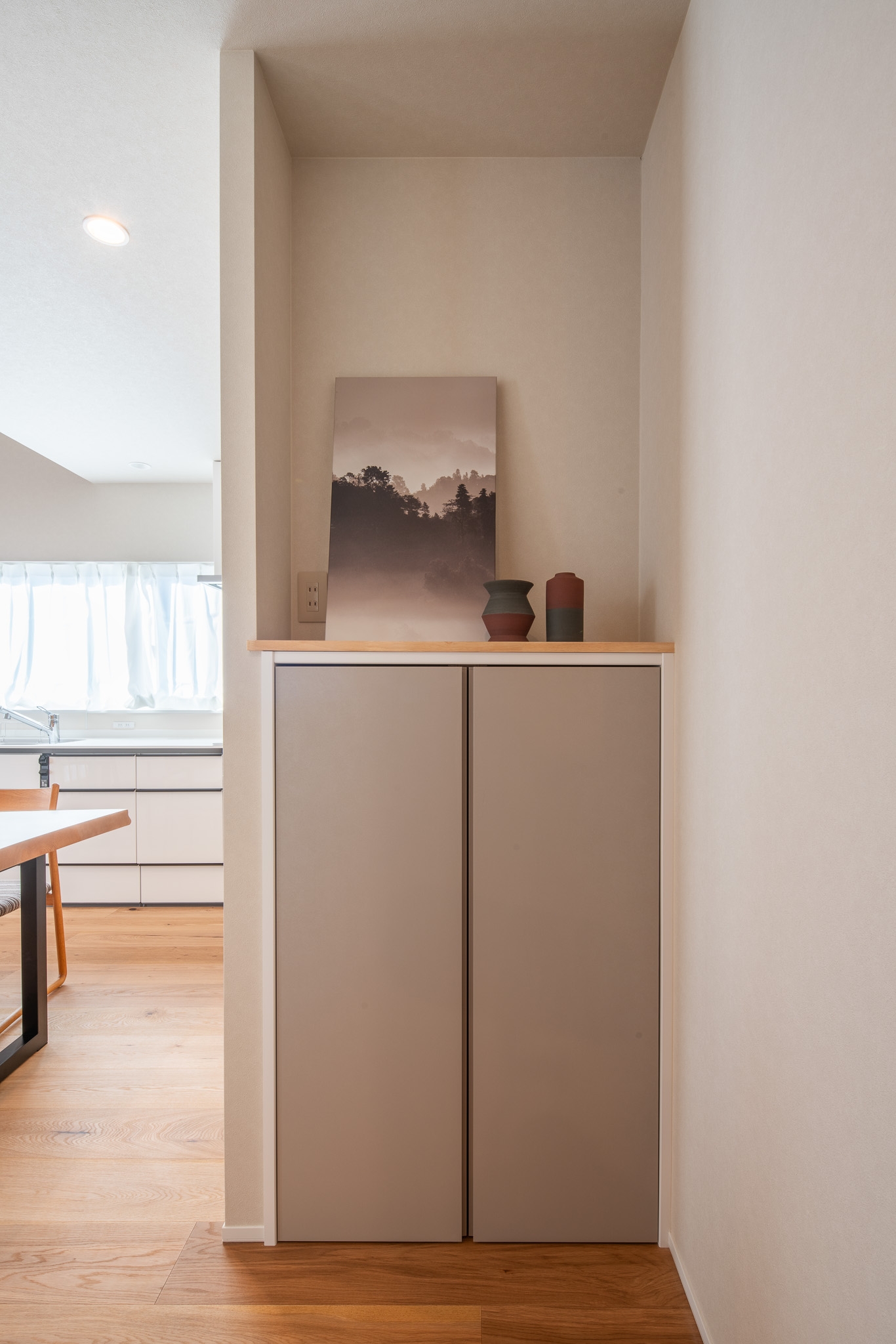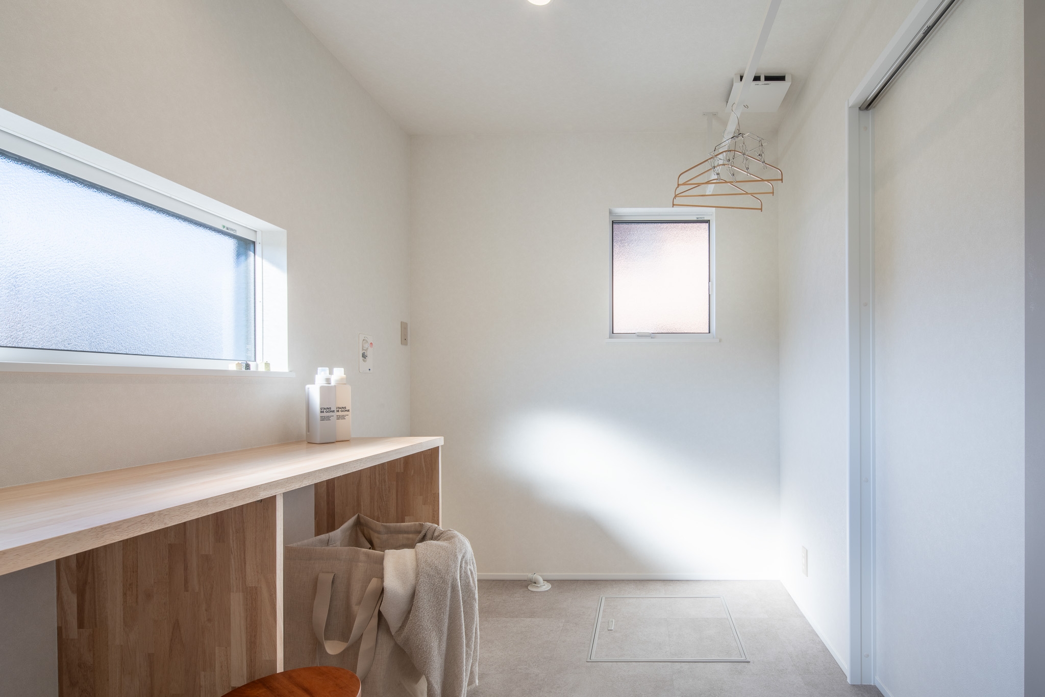 利休のモデルハウスでは、 “つくる”だけでなく “その先の暮らし” を大切にした住まいをご体感いただけます。 自然素材の心地よさ、動線の工夫、 毎日の暮らしが少し軽やかになるアイデアを 実際に歩きながら感じていただける場所です。玄関すぐの吹き抜けは、 明るさと開放感を確保するための工夫のひとつ。 階段・収納・動線をコンパクトにまとめながら、 空間は広く、気持ちはゆったりと。 リノベーションでも叶えられる、 「広く感じる家づくり」です。